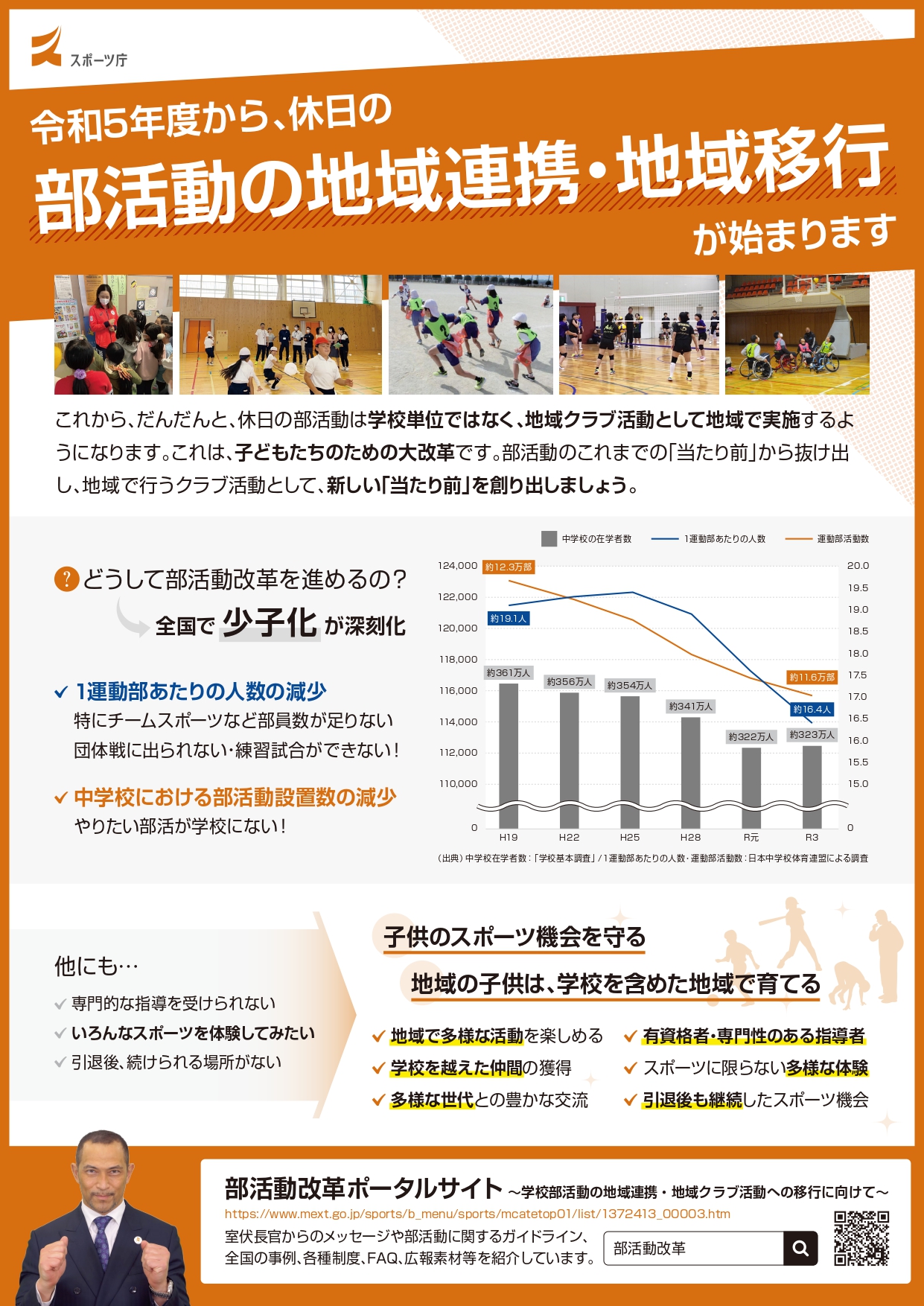 少子化が進展する中、学校部活動を従前と同様の体制で運営することは難しくなってきており、学校や地域によっては、存続が厳しい状況にあります。