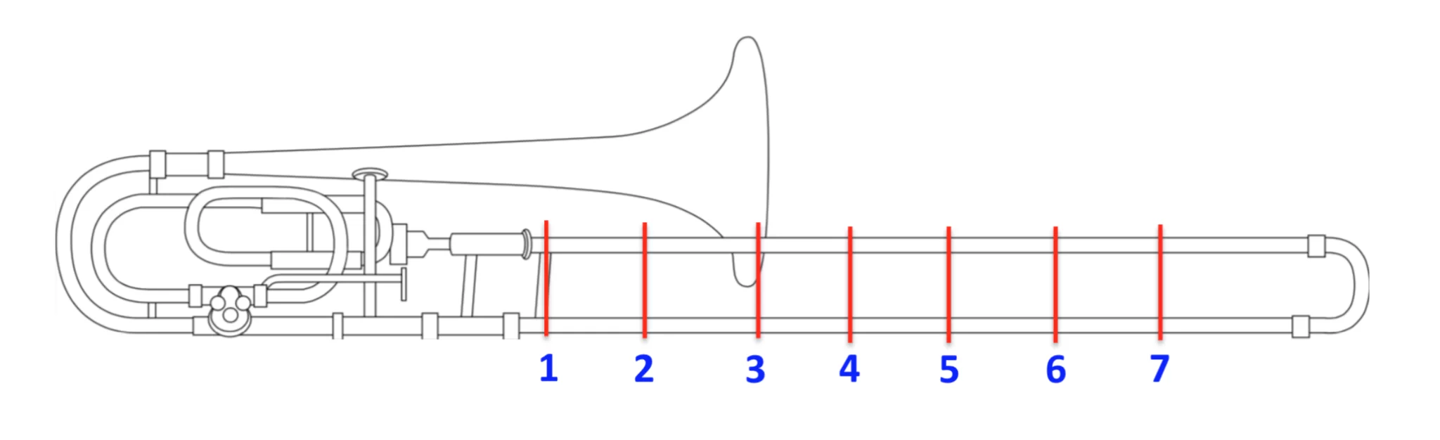 前述したとおり、トロンボーンはスライド管を使って管の長さを変えることで、音階をコントロールします。スライド管をスライドする位置のことを、「スライドポジション」と呼びます。スライドポジションは7つあり、手前から第1ポジション、第2ポジションと呼び、第7ポジションまで続きます。