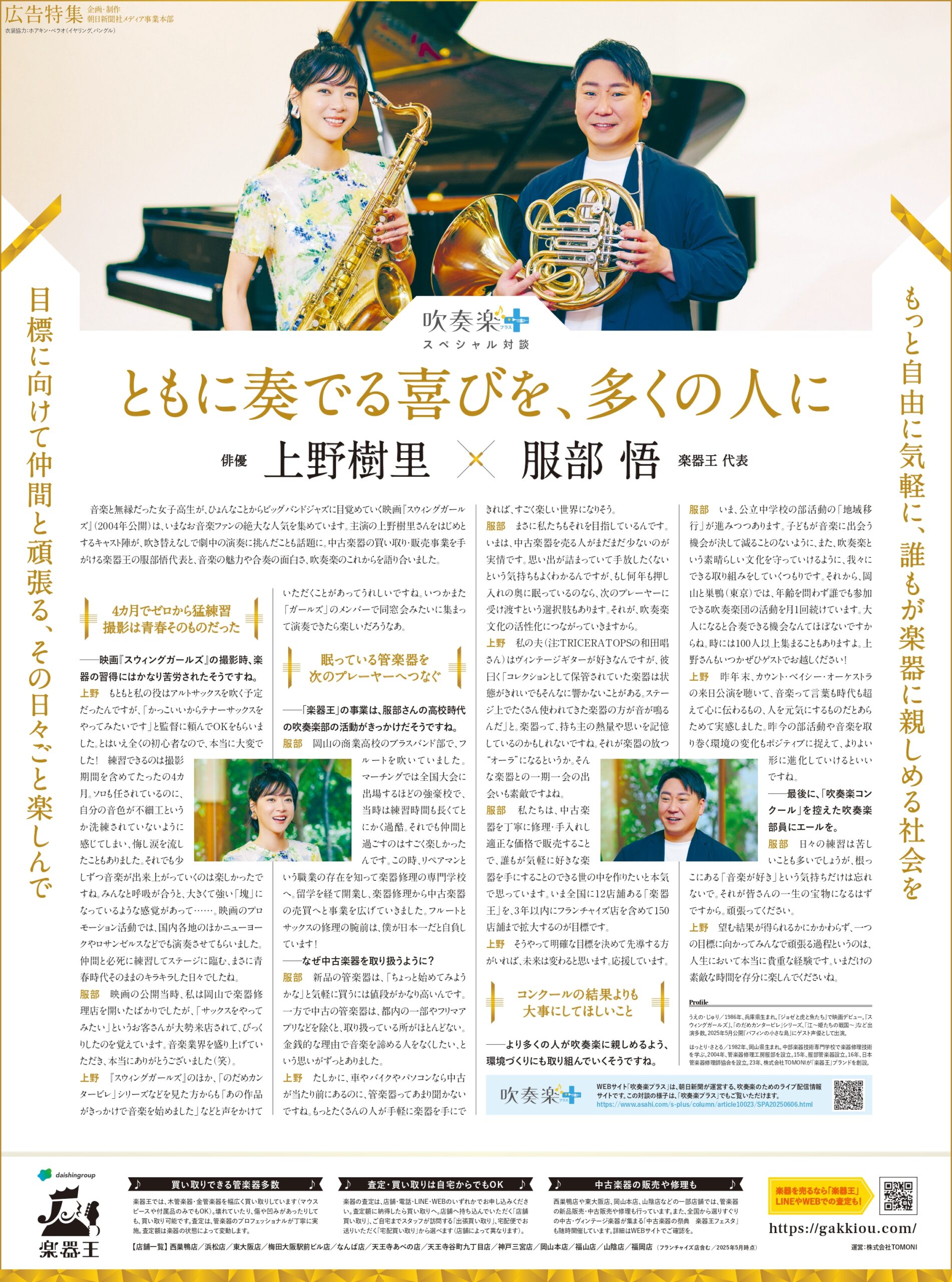 【朝日新聞掲載】服部管楽器代表・服部悟が上野樹里さんと音楽の未来を語りました