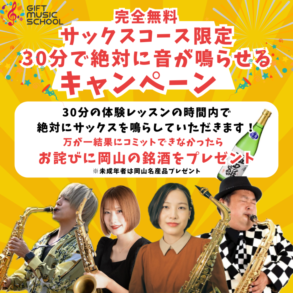 また、サックスに関しては「30分で音が鳴らなければお詫びの品差し上げますキャンペーン」を実施中!(期間限定開催)